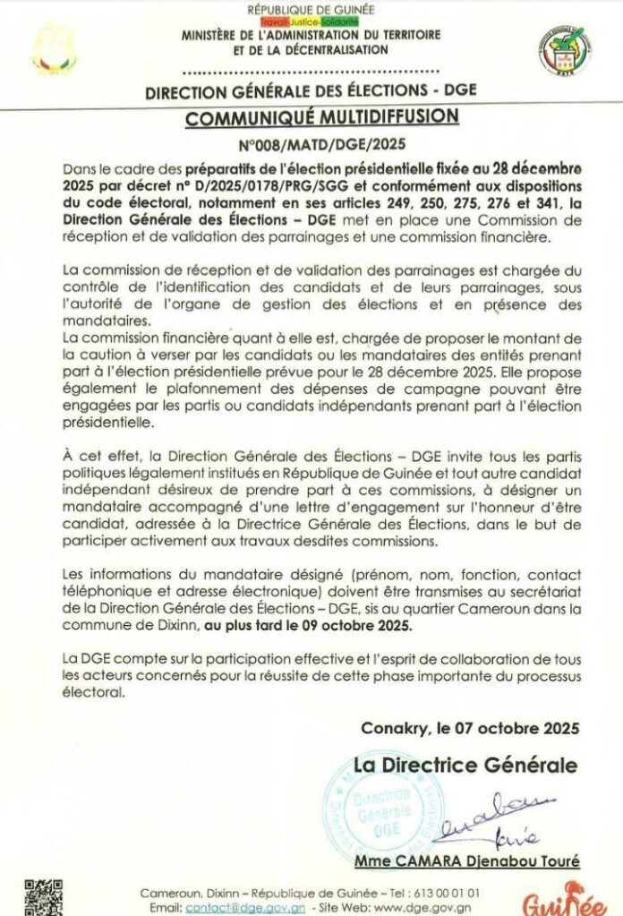 By Guinée NondiOct 08, 2025, 11:43 amCommentaires fermés sur Présidentielle en Guinée : la DGE annonce l’ouverture des parrainages (communiqué)