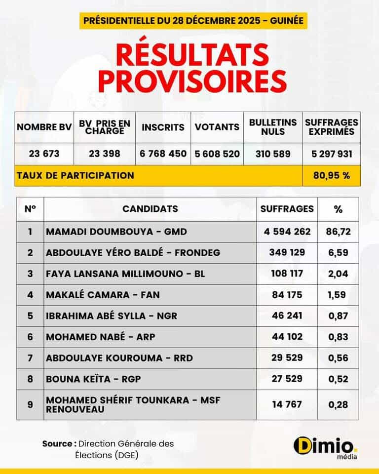 La Direction Génèrale des Élections (DGE) a procédé ce mardi 30 décembre 2025 à la proclamation des résultats provisoires de l’élection présidentielle de 28 décembre 2025.