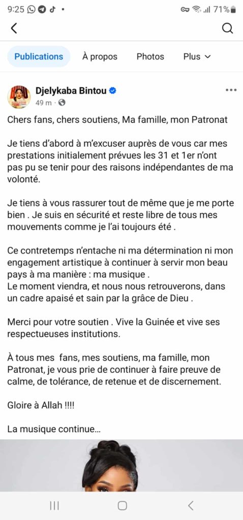 Dans ce communiqué, l’artiste présente ses excuses à son public pour ces concerts non honorés, dit être en sécurité.