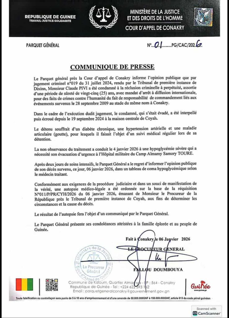 By Guinée NondiJan 06, 2026, 22:51 pmCommentaires fermés sur Urgent : décès du colonel Claude Pivi à Conakry