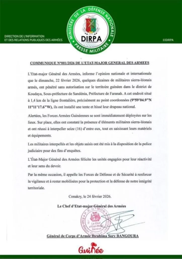 By Guinée NondiFév 25, 2026, 10:22 amCommentaires fermés sur Insécurité : l’Etat-Major Général des armées guinéennes annonce l’arrestation de 16 militaires sierra-léonais (communiqué)